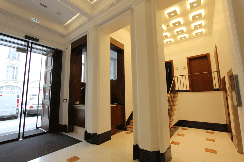 Auf den Wunsch des Bauher- ren, eine attraktive Haupt- stadt-Repräsentanz zu er- richten, sollte ein klassizis- tisches Gebäude in ein Mul- tifunktionsgebäude umge- wandelt werden. Durch sen- sible Eingriffe in die denk- malgeschützte Bausubstanz wurde der schwere Cha- rakter des einstigen Bank- gebäudes in einen leichten und transparenten Baukör- per umgeformt, der Räum- lichkeiten für Veranstaltun- gen und Büros vereint. Eine klare Linie, erzielt durch de- taillierte Ausbauplanung der einzelnen Räume und die Wahl hochwertiger Materi- alien, reflektiert den hohen Anspruch des Bauherren.
