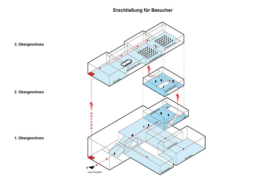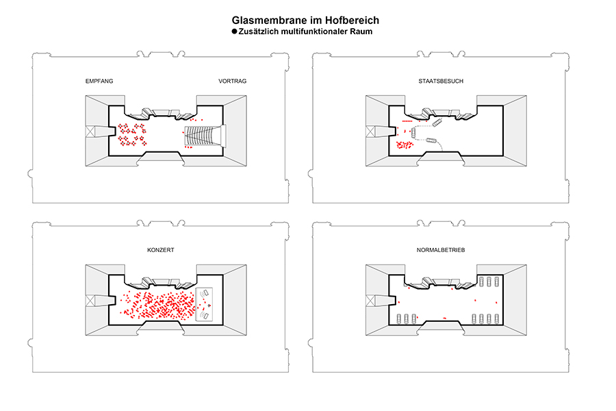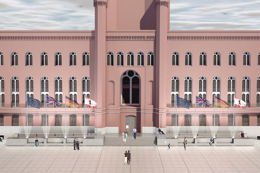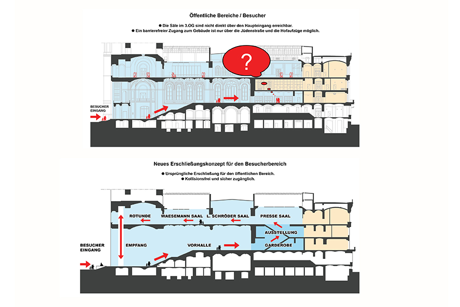Derzeit ist das Rote Rathaus für Besucher nur einge- schränkt barrierefrei zu- gänglich. Staatsgäste wer- den über einen unan- gemessenen Nebeneingang zum Hof empfangen. Durch eine neue Zonierung wer- den diese Defizite beseitigt. Ziel der Studie ist es eine kollisionsfreie und sichere Erschließung des Gebäudes für Besucher, Staatsgäste und Mitarbeiter zu er- möglichen. Barrierefreie Zugänge in allen Bereichen und Witterungsschutzmaß- nahmen in den Höfen bieten zusätzliche Qualitäten. Die Studie zeigt Lösungen für dieses komplexe Thema auf.