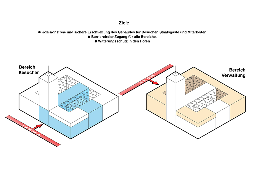 Derzeit ist das Rote Rathaus für Besucher nur einge- schränkt barrierefrei zu- gänglich. Staatsgäste wer- den über einen unan- gemessenen Nebeneingang zum Hof empfangen. Durch eine neue Zonierung wer- den diese Defizite beseitigt. Ziel der Studie ist es eine kollisionsfreie und sichere Erschließung des Gebäudes für Besucher, Staatsgäste und Mitarbeiter zu er- möglichen. Barrierefreie Zugänge in allen Bereichen und Witterungsschutzmaß- nahmen in den Höfen bieten zusätzliche Qualitäten. Die Studie zeigt Lösungen für dieses komplexe Thema auf.
