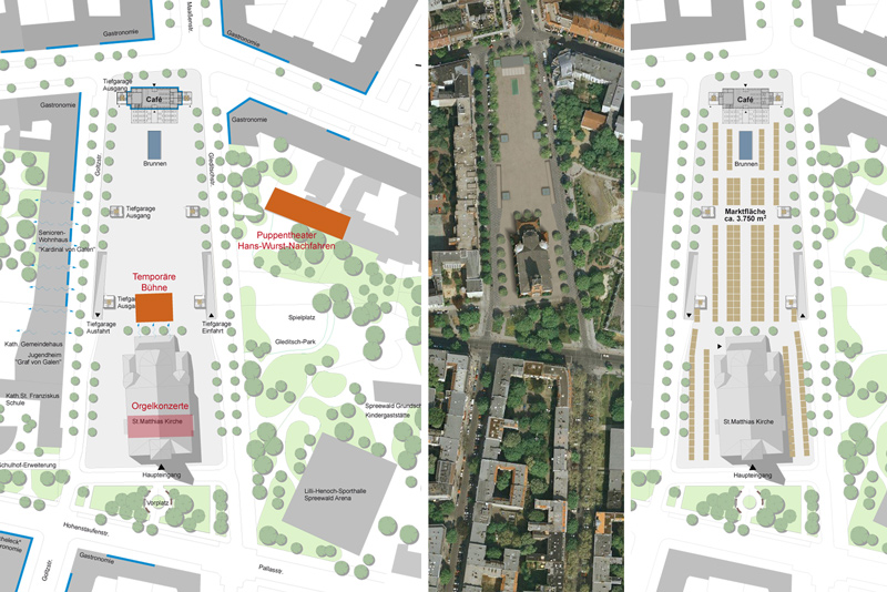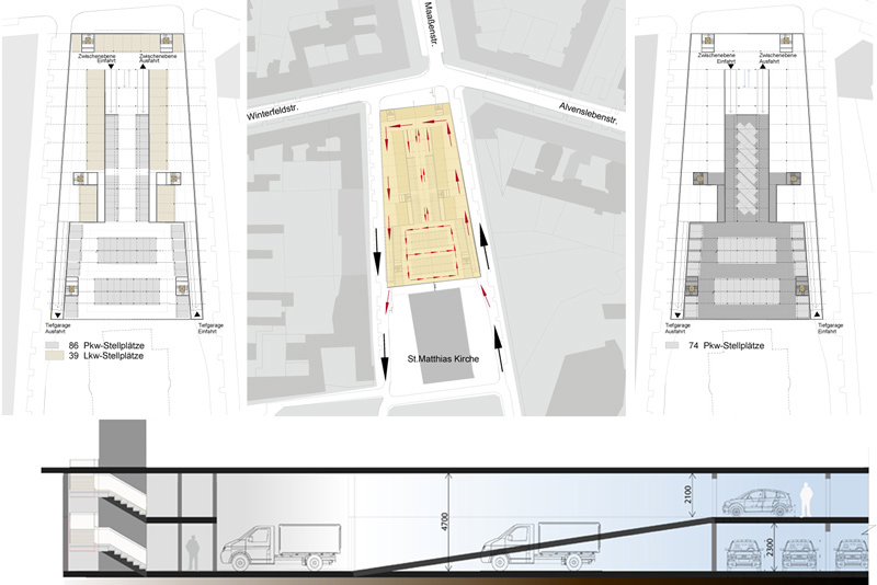 Der Winterfeldtplatz soll in Anlehnung an den histori- schen Raum neu gestaltet werden, um die dadurch er- weiterte Nutzung für einen der wichtigsten Märkte Ber- lins zu verbessern und eine neue Aufenthaltsqualität zu schaffen. Die Parkplatzsi- tuation wird durch die Tief- garage unterhalb der Markt- fläche entspannt. In der eingeschossigen Ebene kön- nen die Transporter der Marktverkäufer sowie im zweigeschossigen Bereich die Pkw der Besucher ab- gestellt werden. Das neu- gestaltete Marktcafé öffnet sich zum Platz hin. Von der Dachterrasse genießt man ungestört die Sonne und beobachtet das Treiben.