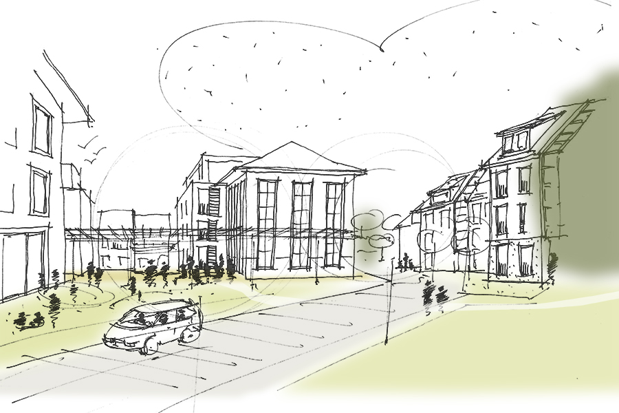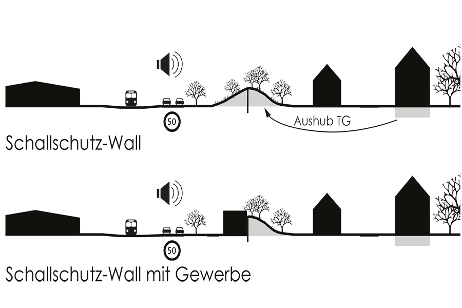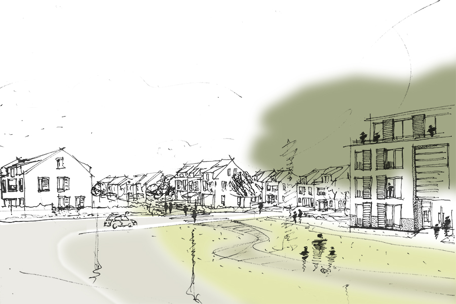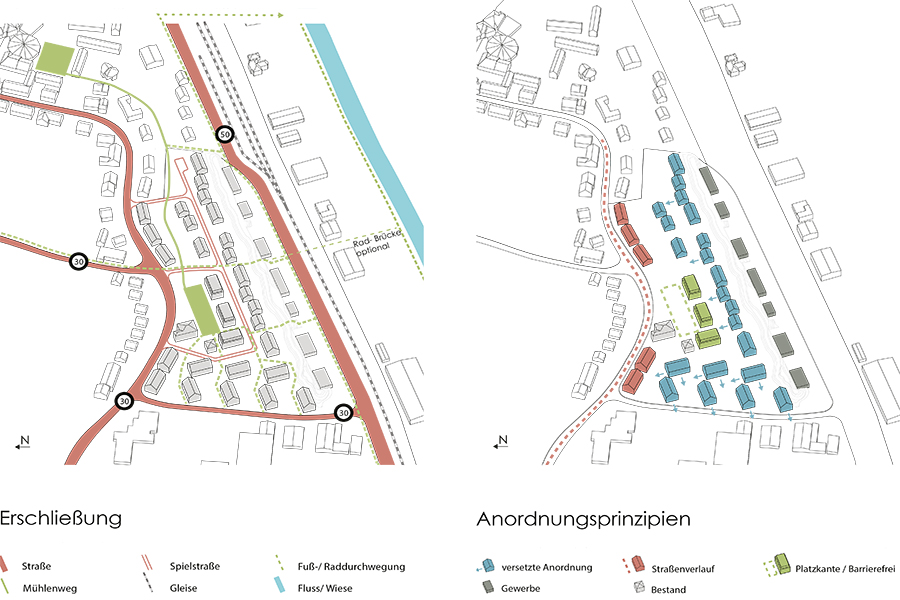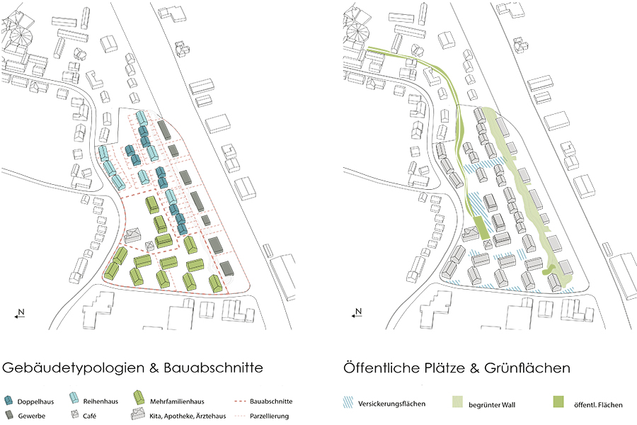 Für eine nachhaltige und qualitativ hochwertige Ent- wicklung des Quelleareals zum beliebten Wohnquar- tier ist das Fortsetzen einer maßstabsvertrauten städt- ischen Struktur an den Orts- kern entscheidend. Im Norden folgen die Geschoss- bauen und Reihenhäuser der Lörracher Straße und bilden eine neue, klare Straßenkante. Im Süden wird das Gebiet durch ein begrünten Wall mit Ge- werbefunktion vor Lärm geschützt. Der Turbinen- platz ist der neue Mittel- punkt des Quartiers.