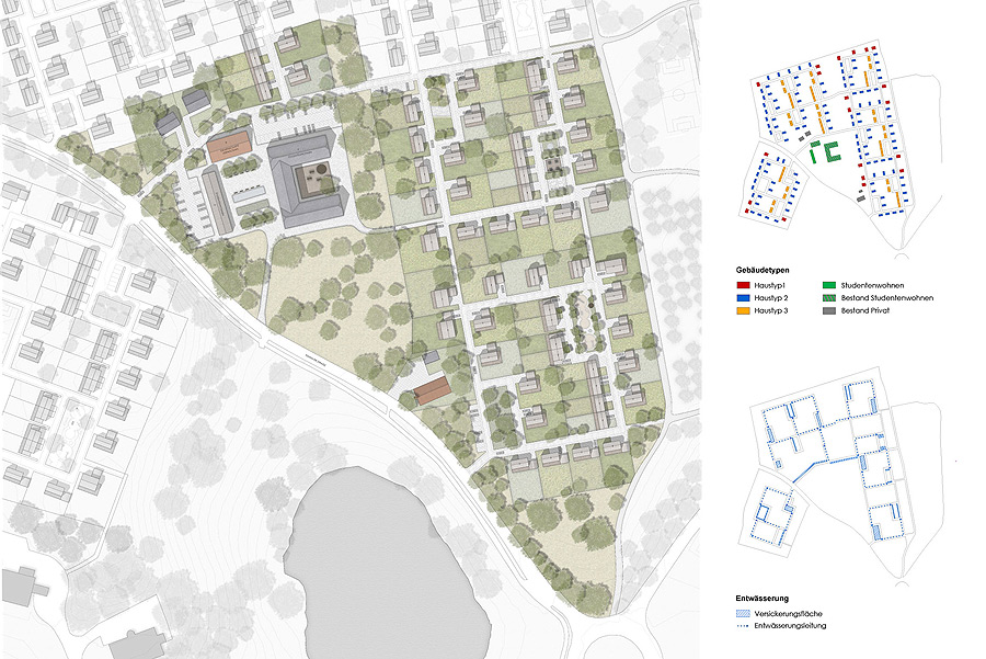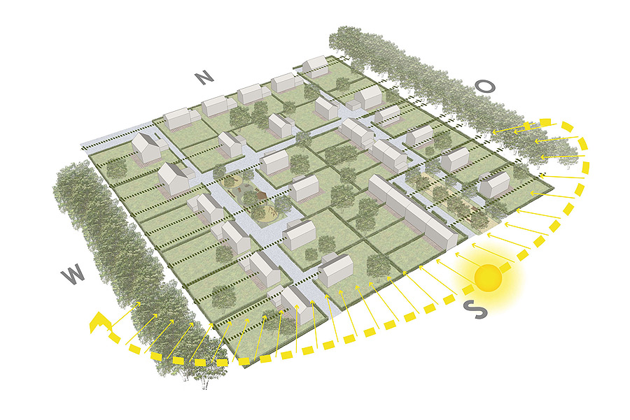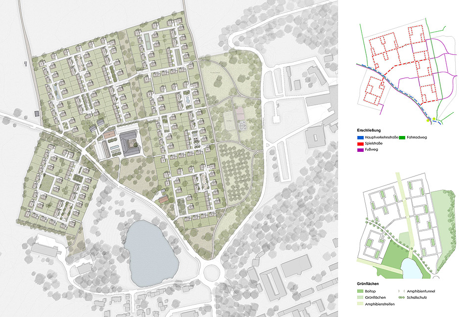 Als Aufgabe galt, das 18,5ha große Gebiet im Westen Kaufbeurens in eine attrak- tive Wohnsiedlung umzu- wandeln. Die Erschließung der einzelnen Teilflächen erfolgt über vier Haupt- wege, die von der Kemnater Straße abgehen. Weitere Erschließungsringe führen zu den Grundstücken. Die optimale Anordnung der Grundstücke schafft eine besondere Wohnqualität und gewährt jedem Haus einen weiten Blick ins Grüne. Durch die gewählte Aufstellung der Gebäude entstehen neue Plätze als Gemeinschaftsflächen für die Anwohner.