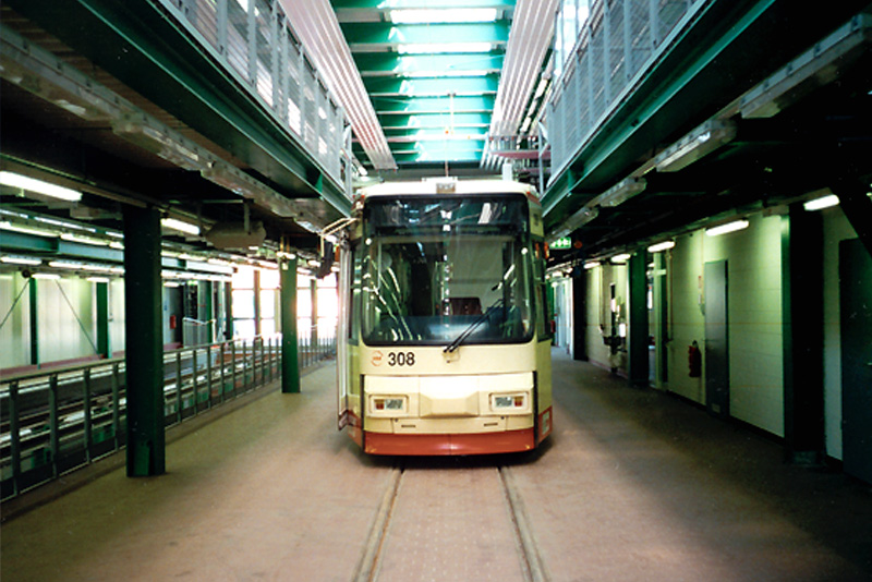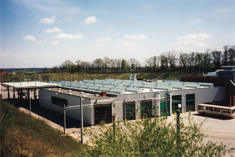 An der Peripherie einer Großwohnsiedlung gelegen, entstand ein Pilotprojekt der Stadtverkehrsgesell- schaft Frankfurt. Der neue Betriebshof vereint Abstell- und Werkstatthallen für Straßenbahnen und Omni- busse. Im Kerngebäude sind Büros, Sozialebene und La- gerräume konzentriert angeordnet. Die universale Wasch- und Tankanlage sowie das Betriebsdienst- zentrum komplettieren das Depot. Ein Gebäudeensem- ble aus verkehrslogistisch an- geordneten leichten Stahlkonstruktionen und tra- ditionellem Mauerwerk prägt den Standort.