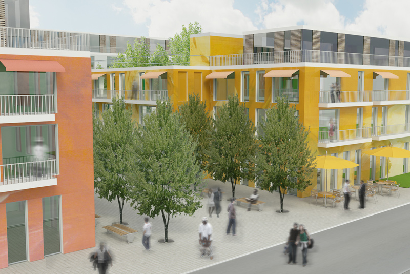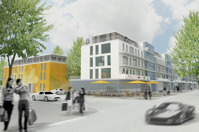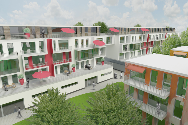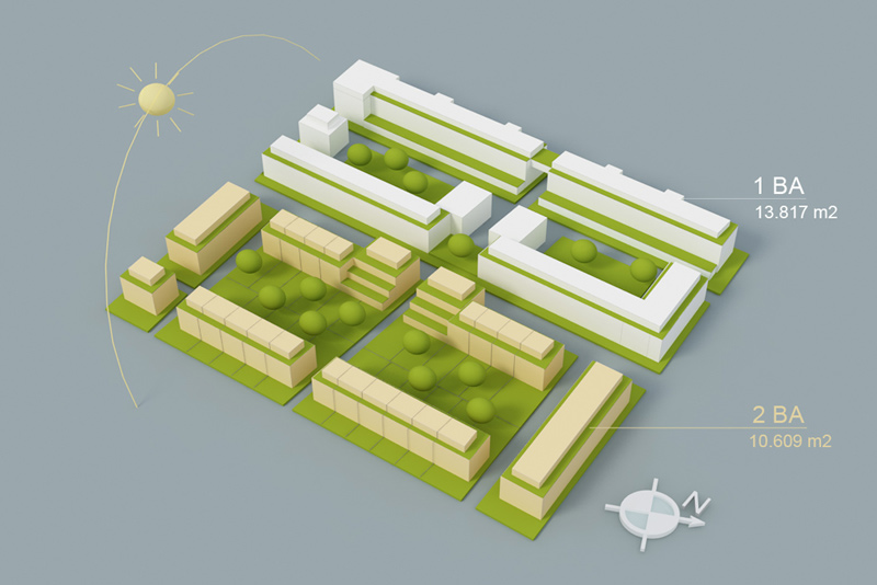 Anstelle des ehemaligen Schlacht- und Viehhofes im Norden Berlins sollte ein modernes Stadtquartier mit Flächen für Dienstleistungs-, Gewerbe- und Handelsein- richtungen in Verbindung mit restaurierten Bestands- bauten entstehen. Gebäu- degruppen die sich entlang der Hauptachsen aufreihen nutzen die erwünschte Be- bauungsdichte maximal aus. Nutzungsneutrale, variable Grundrisse ermög- lichen ein Mehrgenerations- wohnen. Grünflächen und halböffentliche Plätze för- dern die Interaktion der Bewohner untereinander.