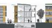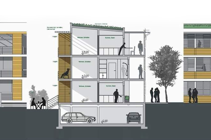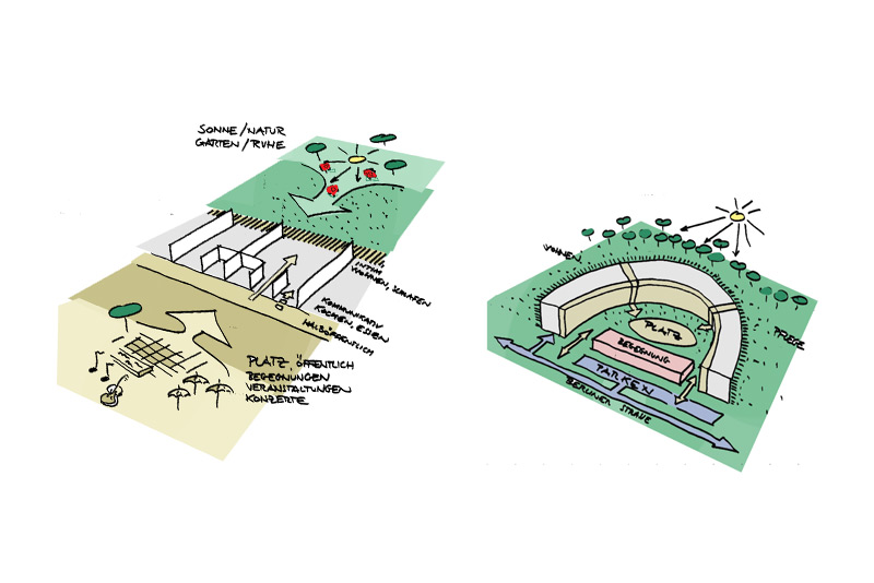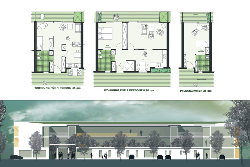Das Seniorenzentrum setzt sich aus mehreren Baukör- pern zusammen, die sich um eine begrünte Fläche an- ordnen und einen privaten Innenhof schaffen. Zur nörd- lichen Hauptstraße orien- tieren sich die öffentlichen Funktionen wie Verwaltung, Bibliothek und Café. Nach Süden ausgerichtet befin- den sich die Gebäude mit den Wohneinheiten sowie die Pflegestation. Auch die Grundrisse der einzelnen Wohnungen teilen sich nach diesem Schema auf. Die Wohnbereiche liegen auf der ruhigen Südseite; Bäder, Küchen und Essplätze wie- derum im Norden.